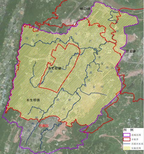 方案实施范围为苦溪河(南岸区段)流域,涉及南岸区天文街道、长生桥镇、峡口镇、迎龙镇等4个镇街,区境内流域面积69.8km2(全流域面积85.9km2)。