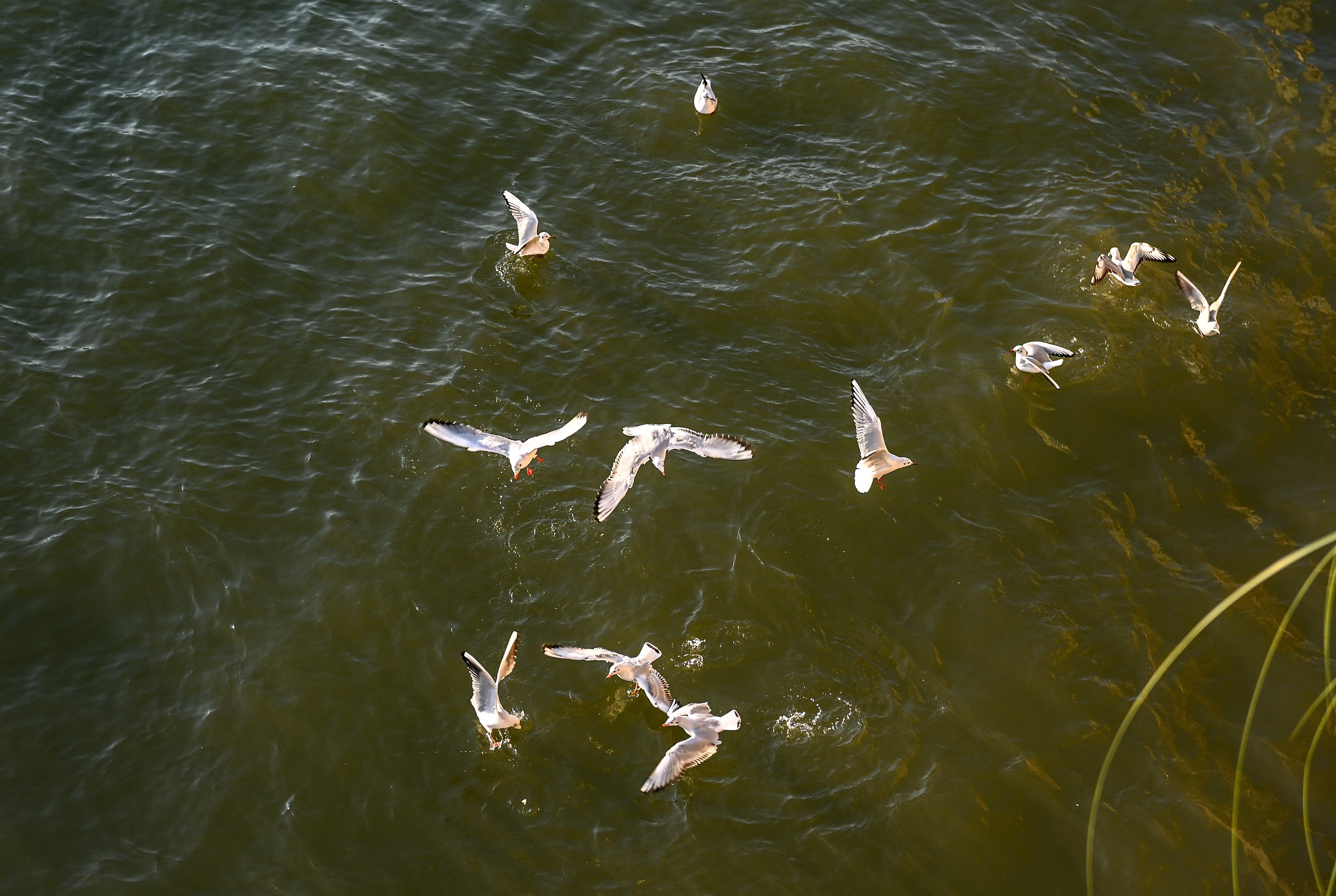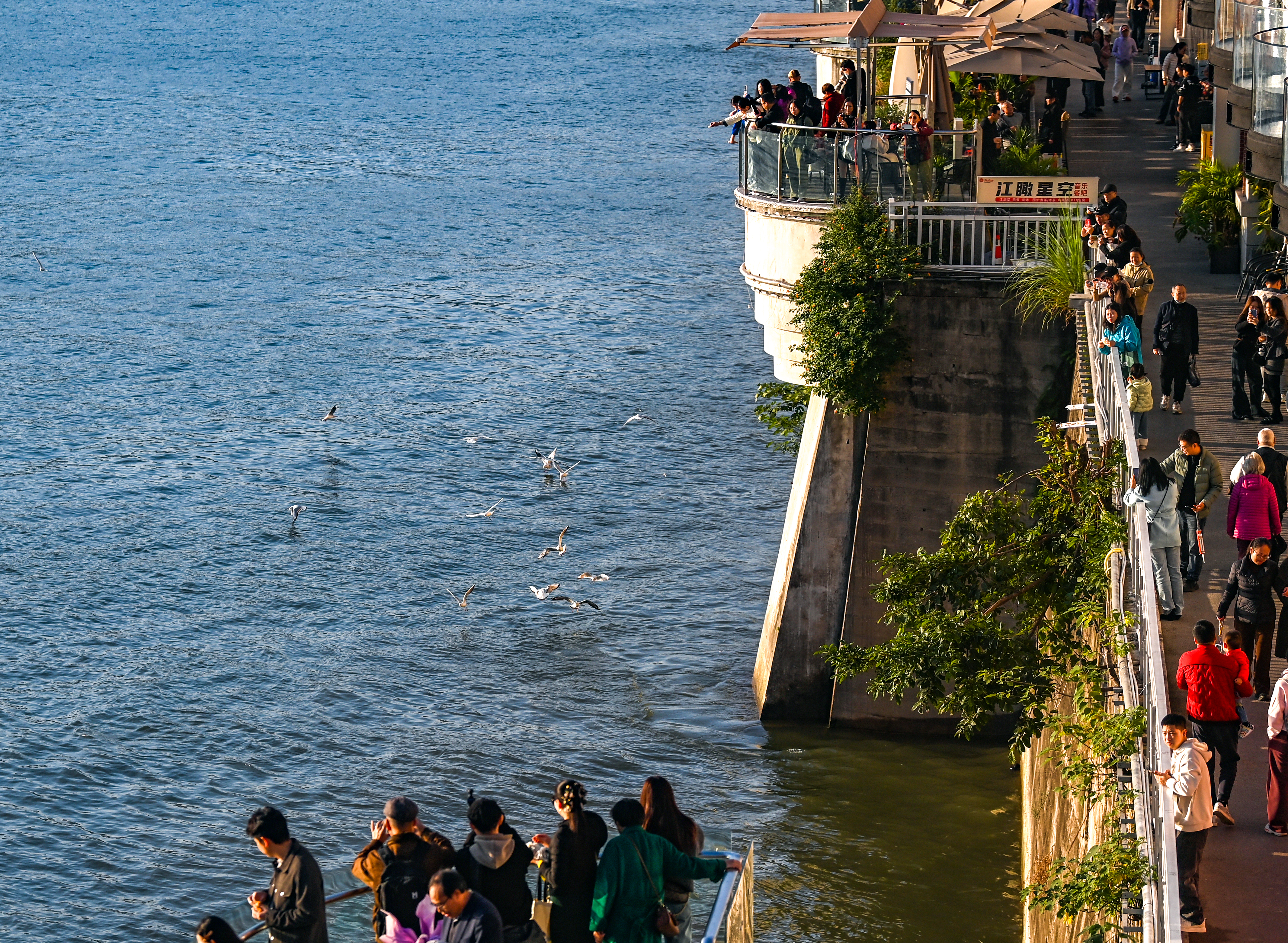 11月20日,南岸区南滨路两江交汇水域,大批西伯利亚红嘴鸥在水中嬉戏,吸引众多市民驻足观赏。