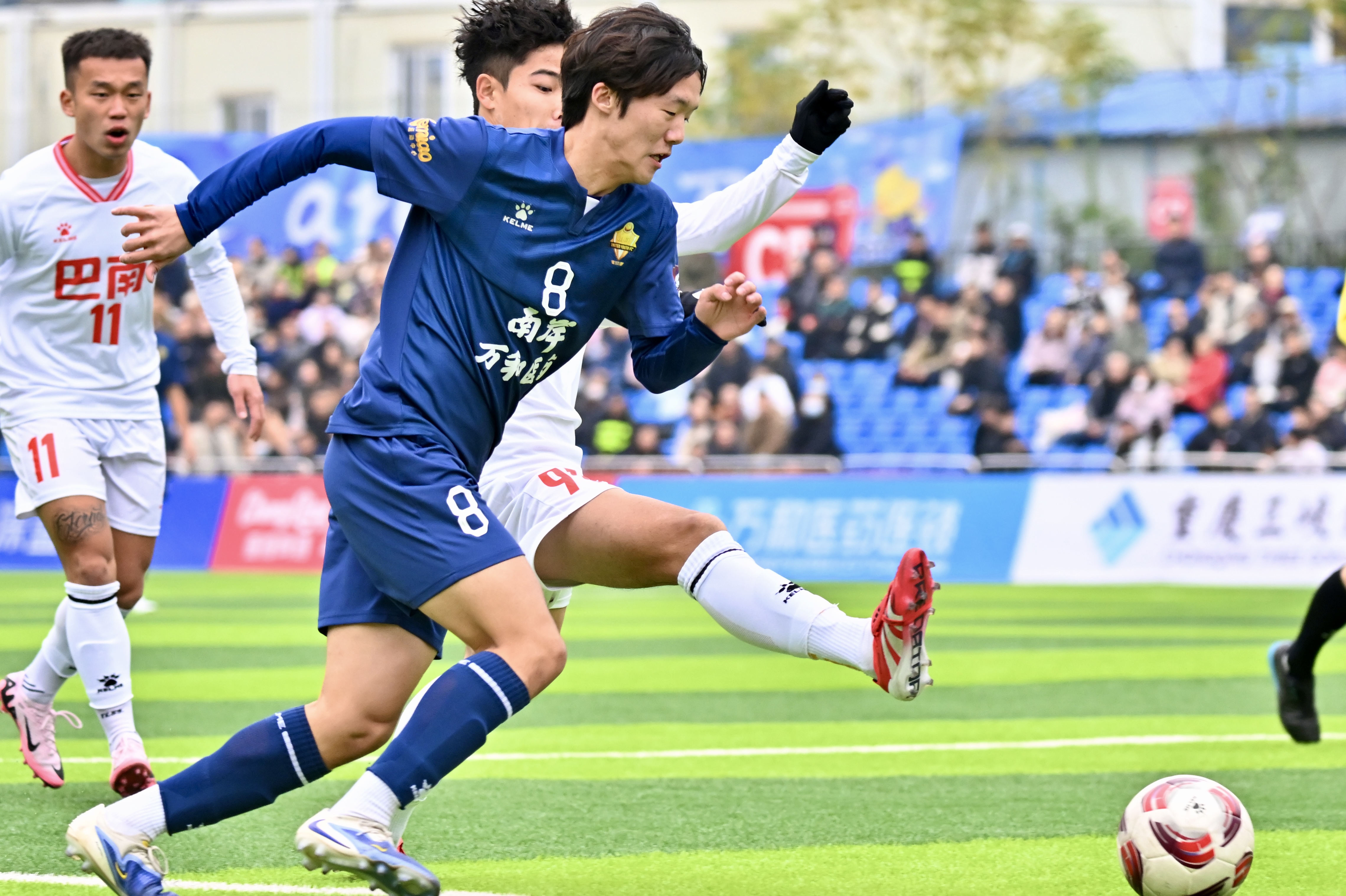 12月14日下午,“渝超”联赛再燃战火,南岸万和医药队在江南体育中心体育场迎战巴南生物城队。经过90分钟激烈角逐,南岸队以3比2力克对手。33号队长宋韩川发挥神勇,独中两元,成为本场比赛的MVP。