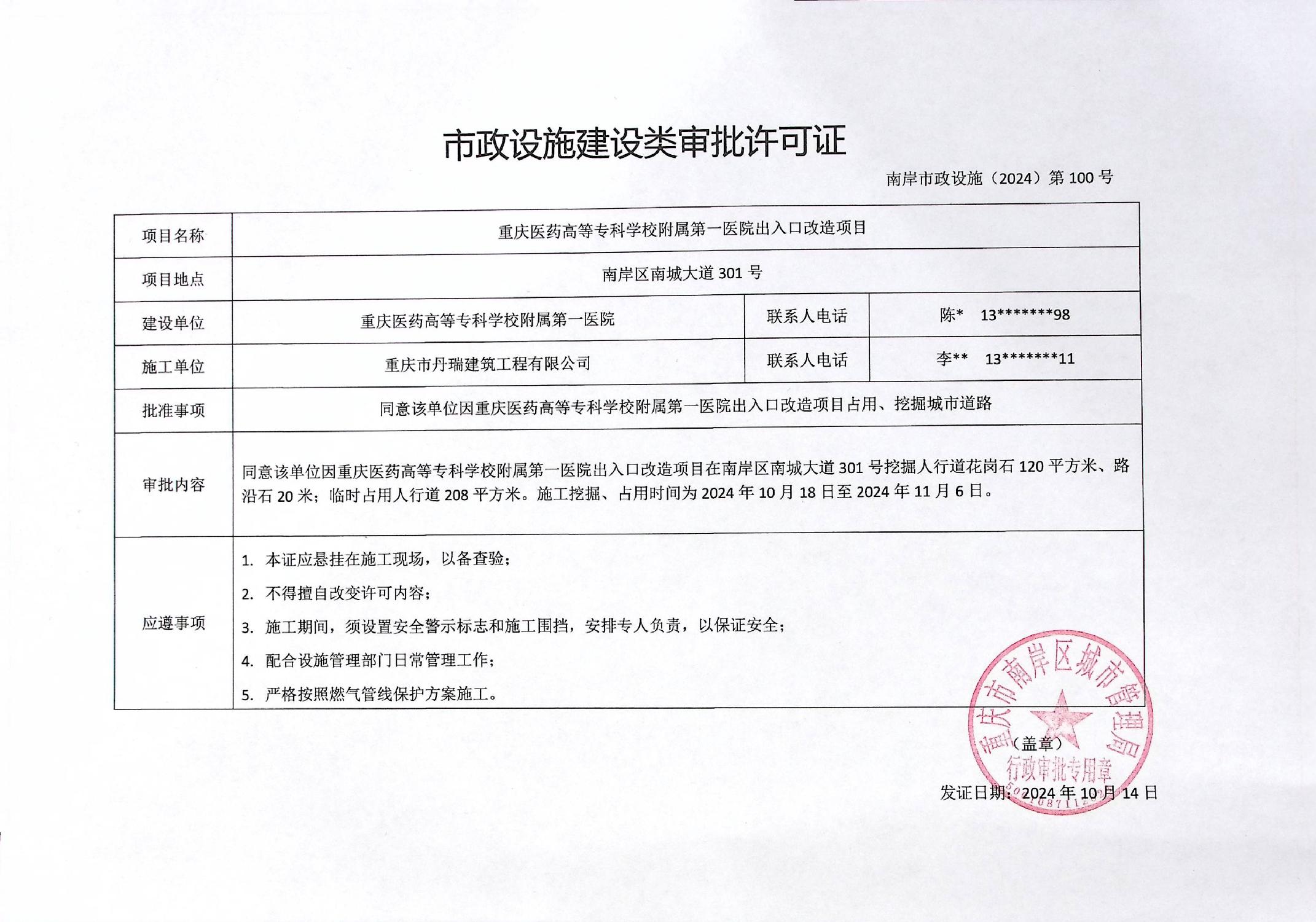 南岸市政设施(2024)第100号-重庆医药高等专科学校附属第一医院出入口改造项目