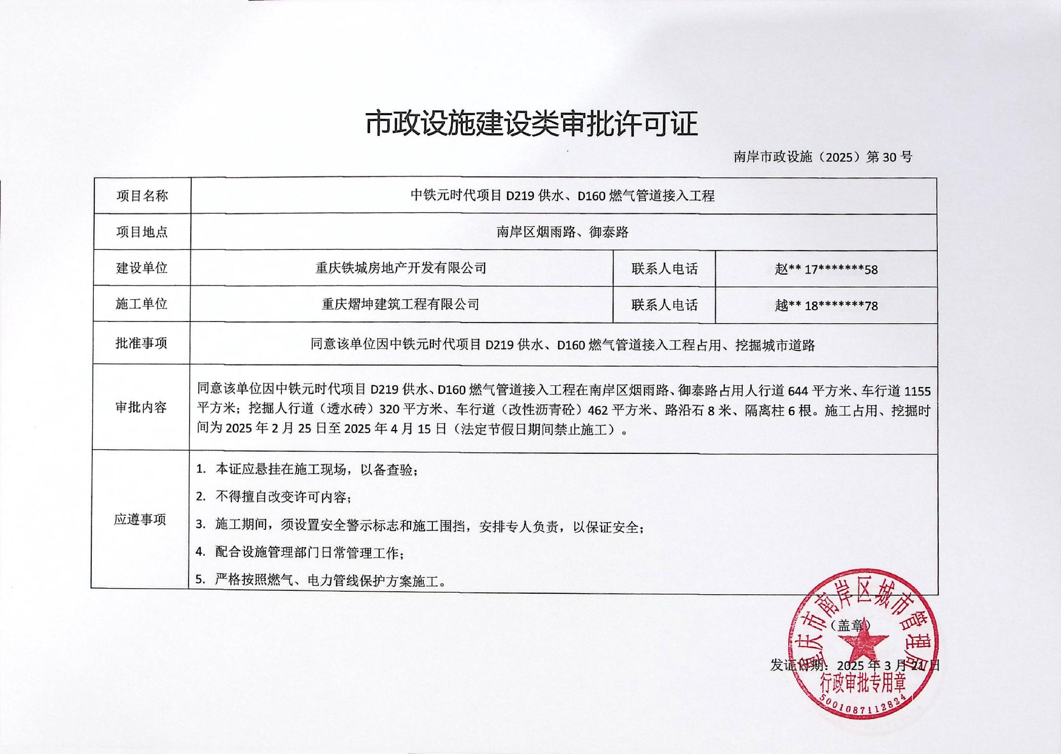 南岸市政设施(2025)第30号-中铁元时代项目D219供水、D160燃气管道接入工程