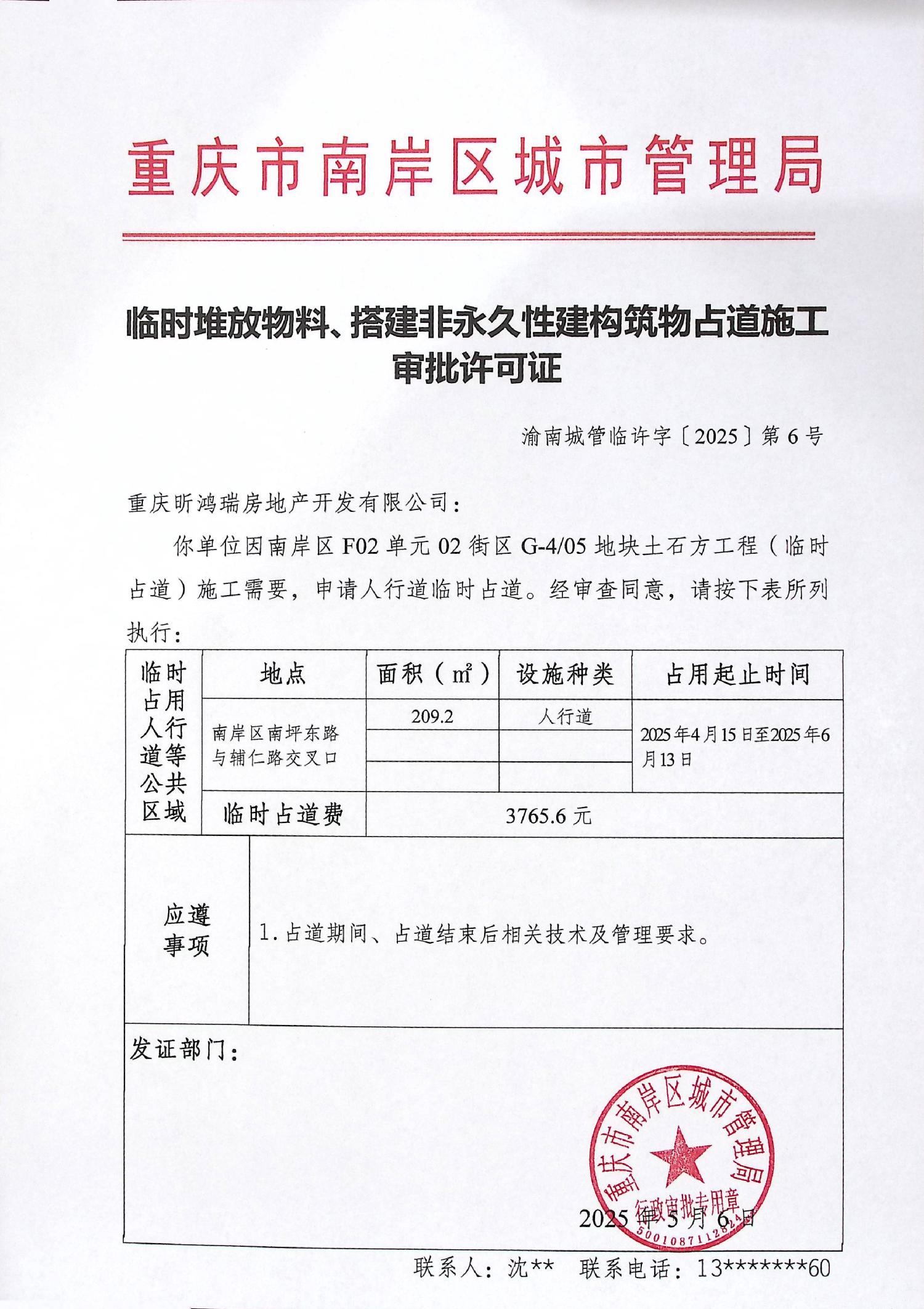 渝南城管临许字〔2025〕第6号-南岸区F02单元02街区G-405地块土石方工程(临时占道)