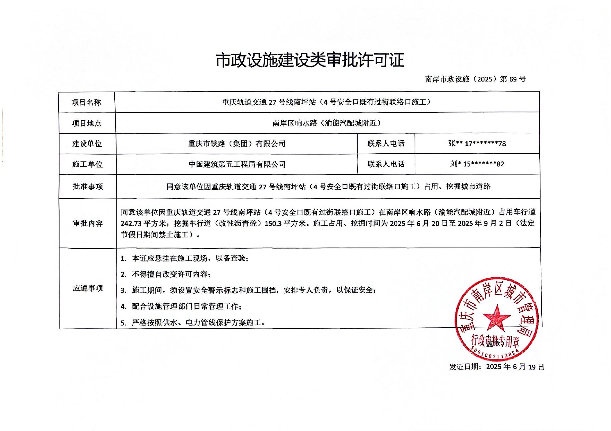 南岸市政设施(2025)第69号-重庆轨道交通27号线南坪站(4号安全口既有过街联络口施工)