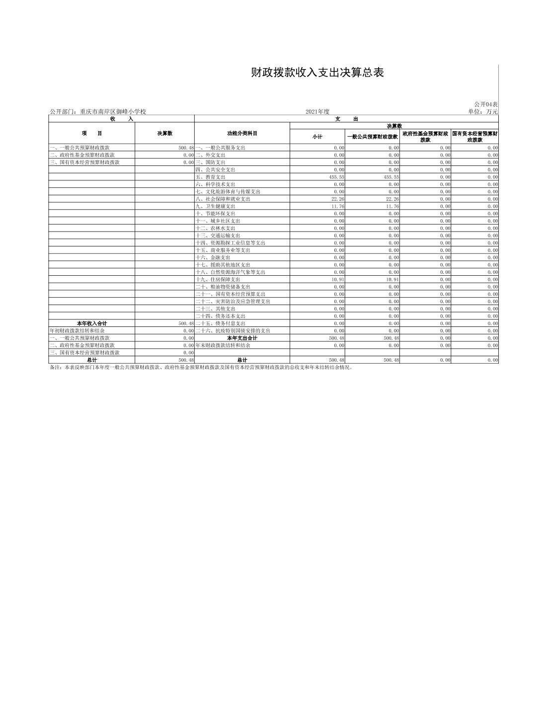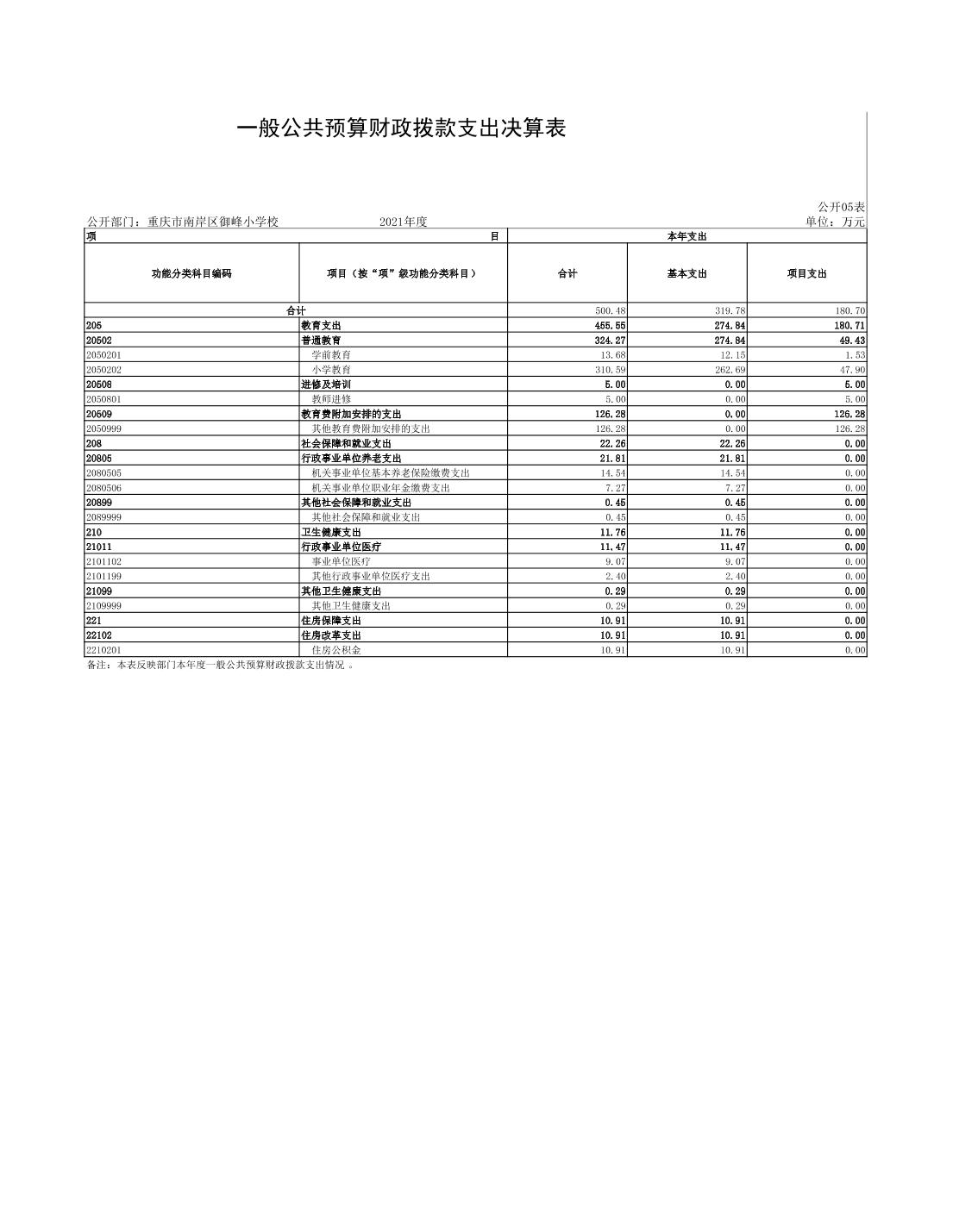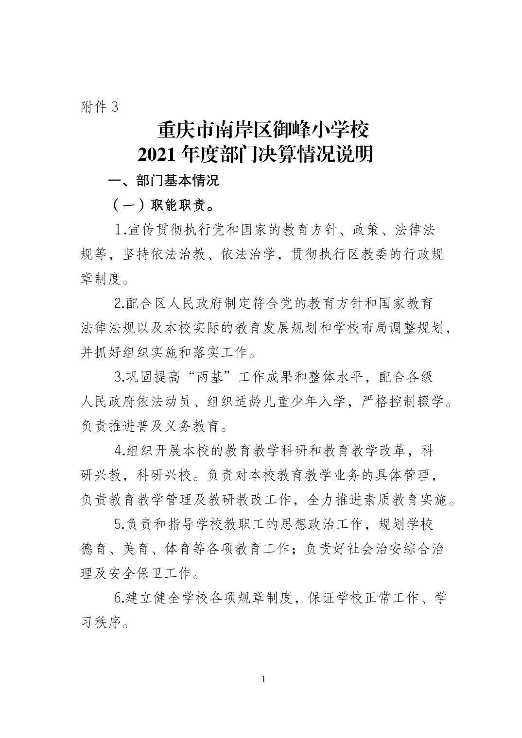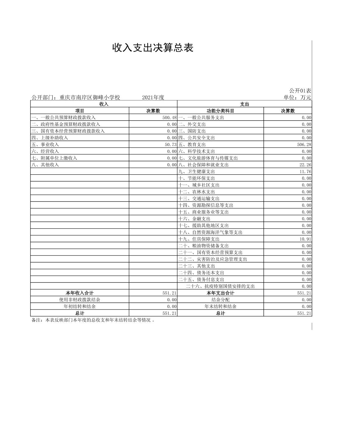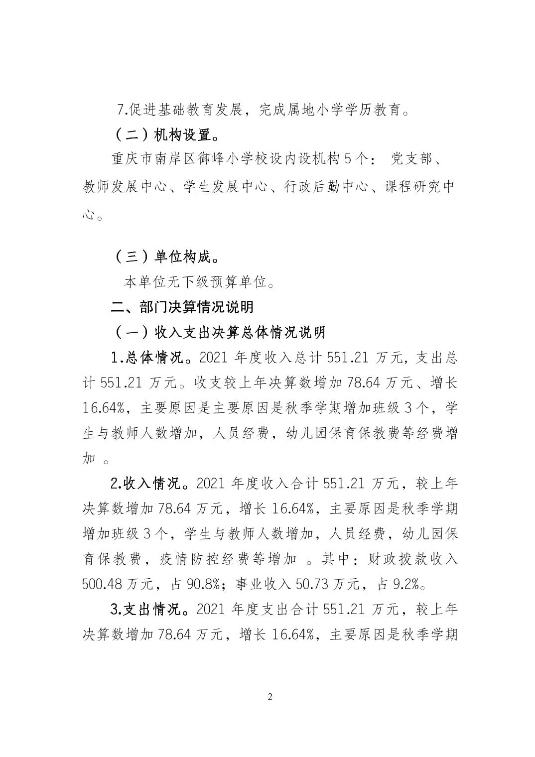 重庆市南岸区御峰小学校2021年决算