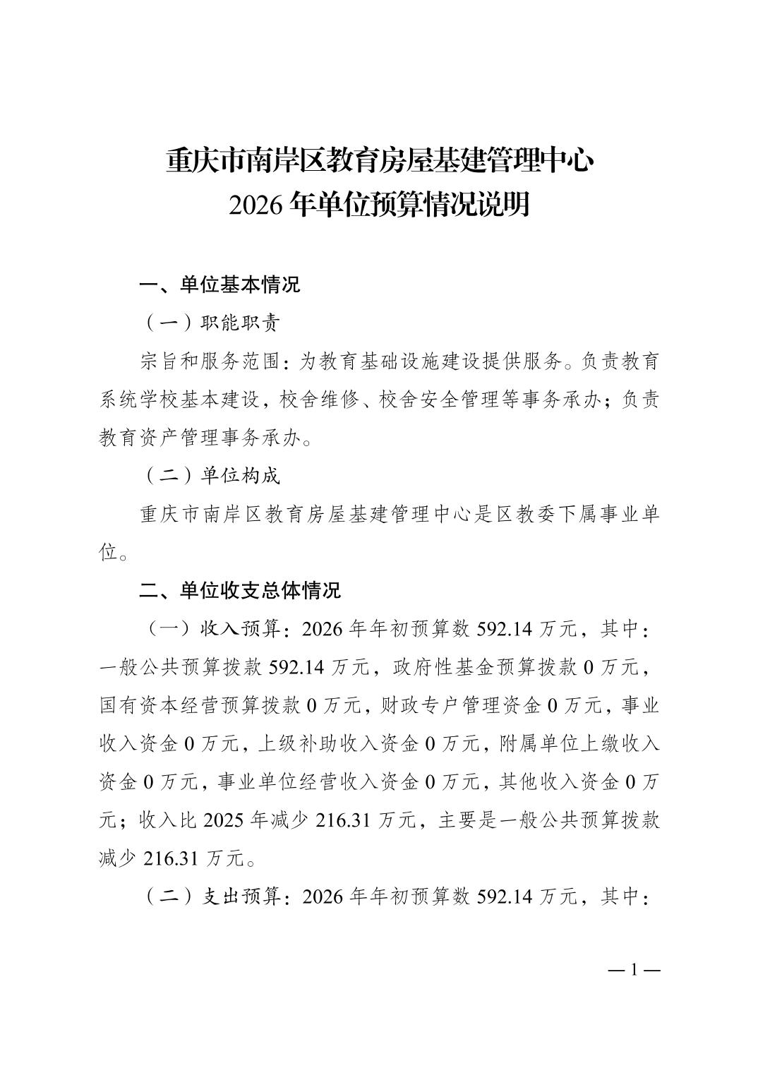 重庆市南岸区教育房屋基建管理中心2026年单位预算情况说明