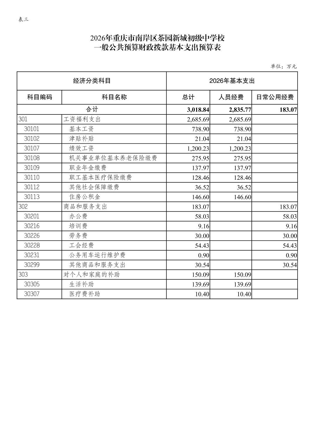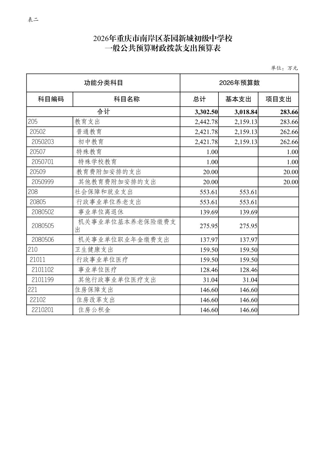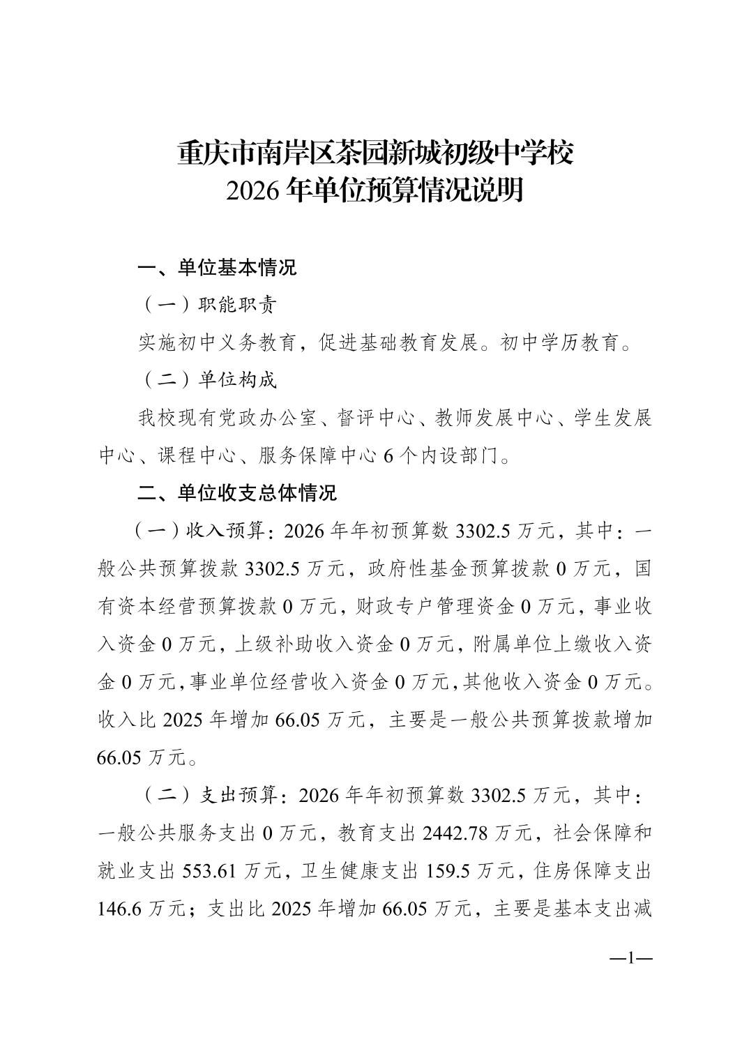 重庆市南岸区茶园新城初级中学校2026年单位预算情况说明