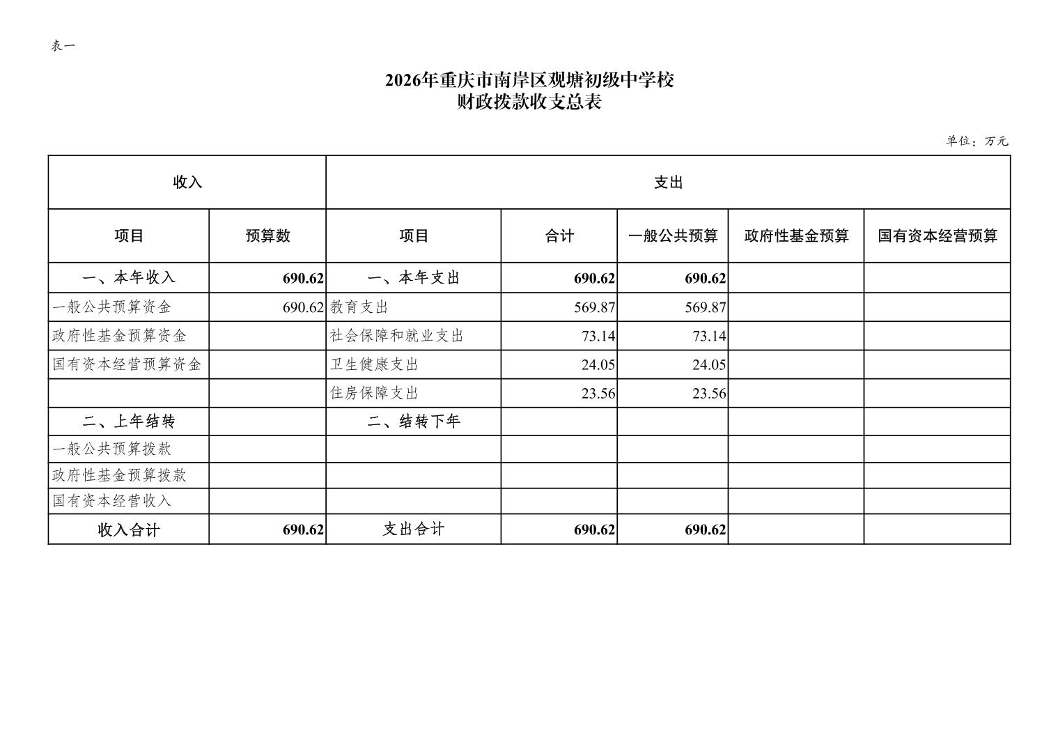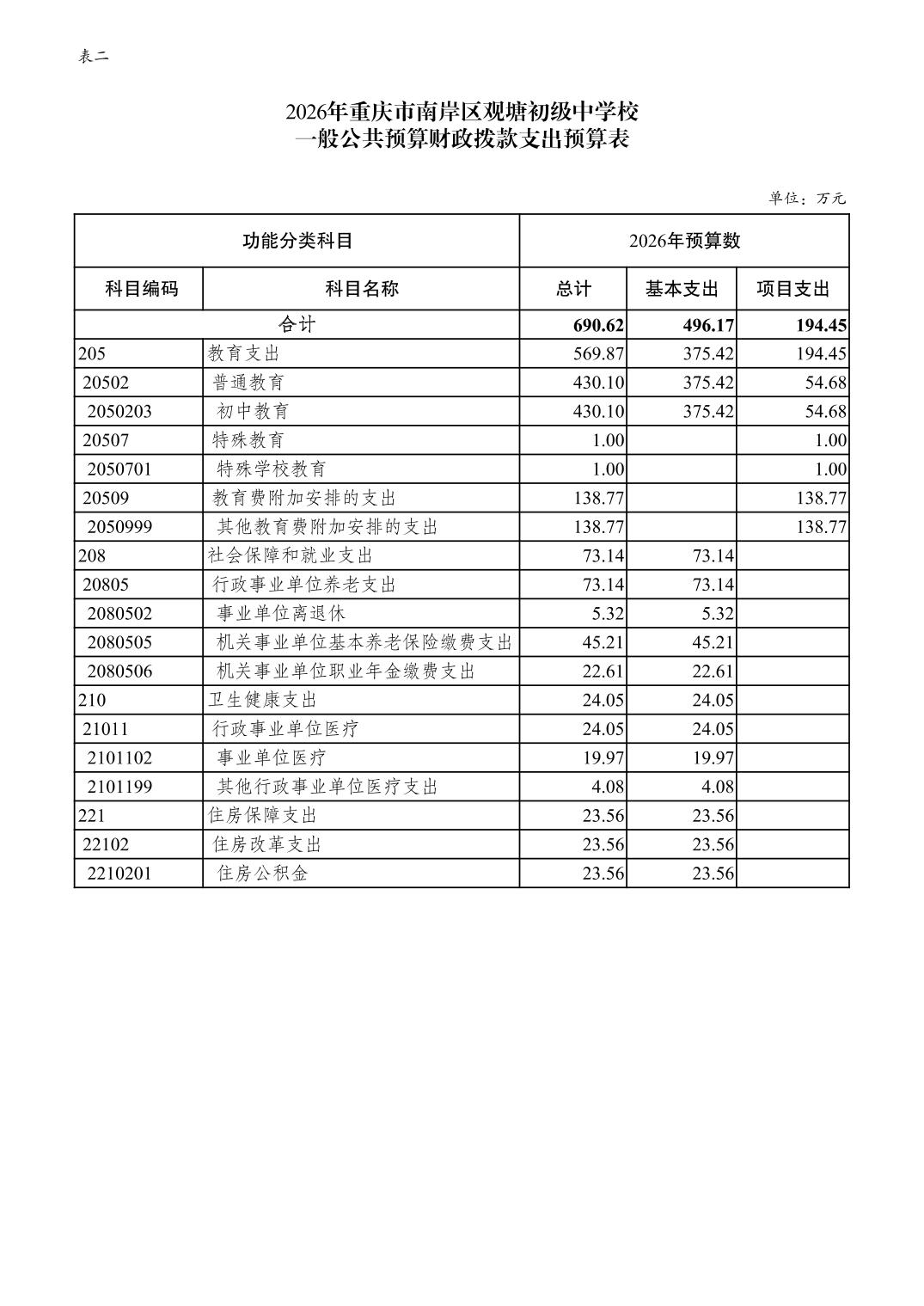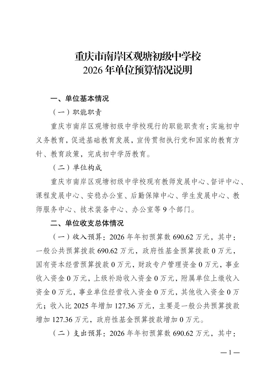 重庆市南岸区观塘初级中学校2026年单位预算情况说明