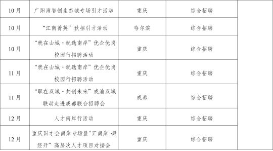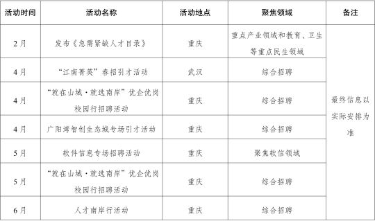 按照计划,2024年,我区将安排各类人才招引活动120余场,在“春招”“秋招”等关键时间节点,集中组织区内用人单位赴市内外重点高校开展大型校园引才活动。活动将进一步聚焦我区“3+2”重点产业发展和“满天星”行动计划实施,在专业学科突出的院校举办专场招聘引才活动,帮助用人单位招引专才、特才。此外,“百万人才兴重庆”“广阳湾智创生态城专场引才”“成渝云牵手·双城共春风”等各类引才招聘活动将常态化开展。依托人社部门和人力资源机构的线上平台,我区还将开展“直播带岗”等特色线上招聘活动。