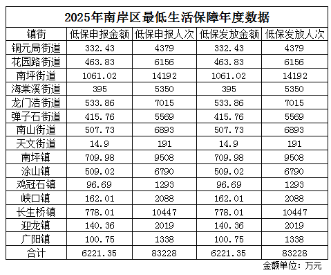 按照南岸区最低生活保障有关政策规定,2025年全区申报最低生活保障对象83228人次,申报金额6221.35万元予以公示(详细名单附后),接受社会监督。