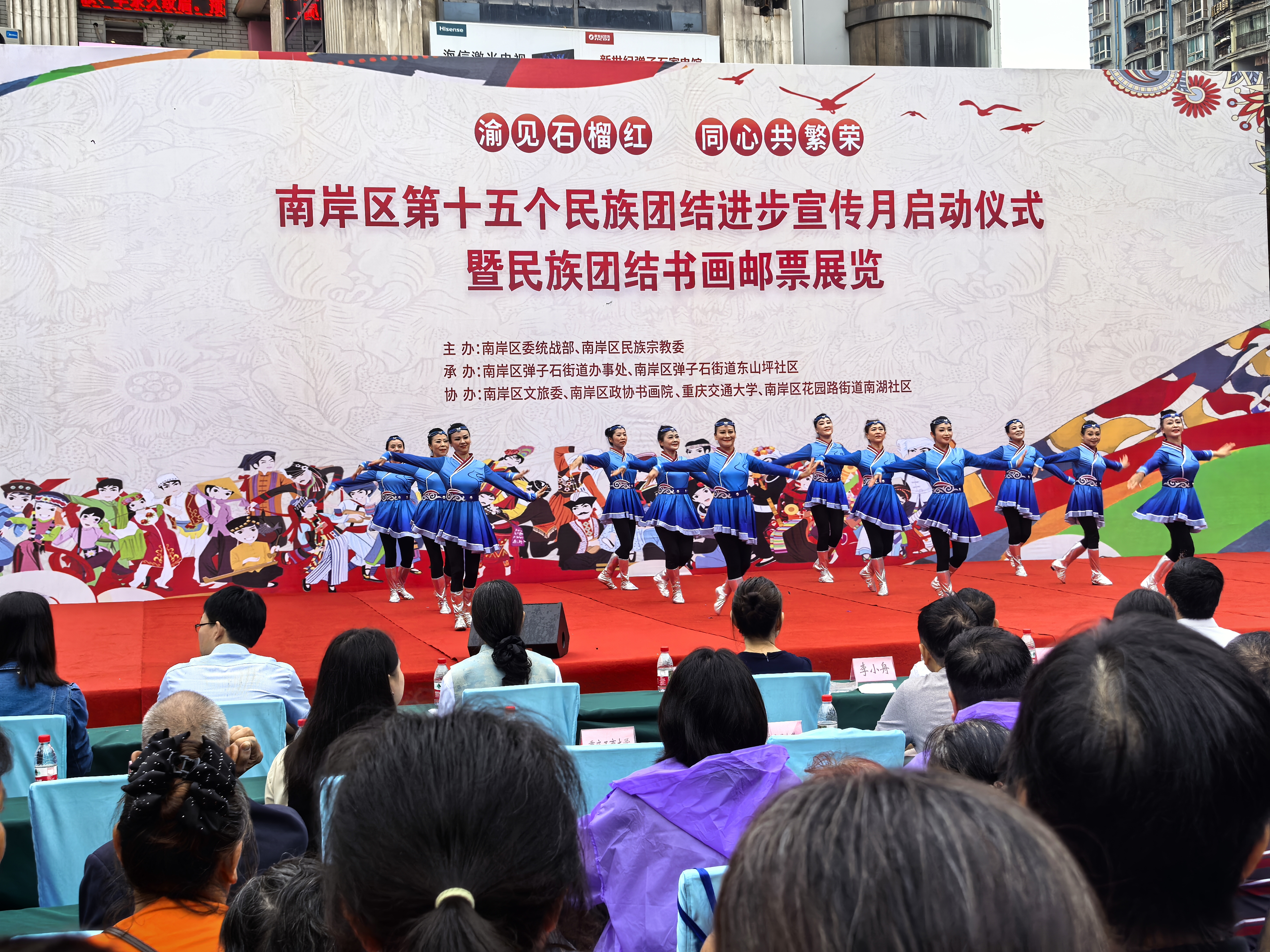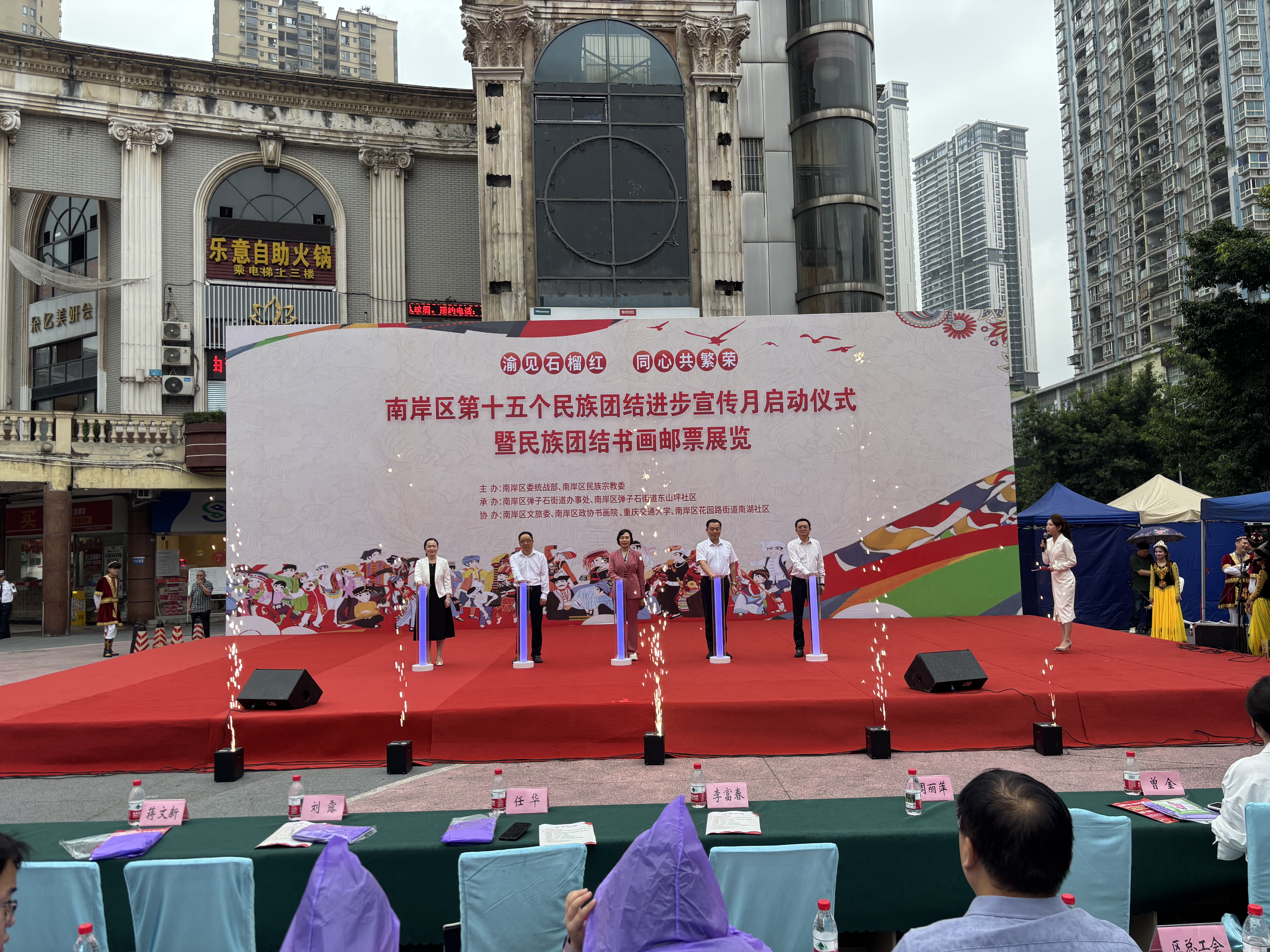 10月17日上午,南岸区第十五个民族团结进步宣传月启动仪式暨民族团结书画邮票展览活动在弹子石宏声假日广场举行。市民族宗教委二级巡视员任华,区委常委、统战部部长刘露,区人大常委会副主任李富春,区政府副区长蒋文新,区政协副主席周丽萍出席活动,区级有关部门、各镇街及在区高校相关负责人、各族群众代表等约200人齐聚一堂,共绘民族团结交融新图景。