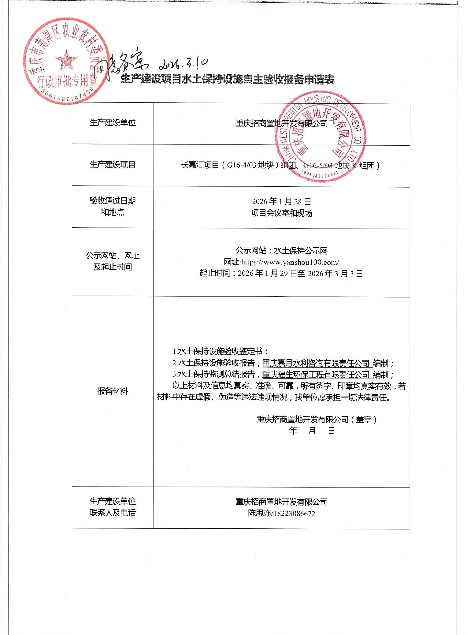 长嘉汇项目(G16-403地块J组团、G16-503地块K组团)自主验收报备申请表