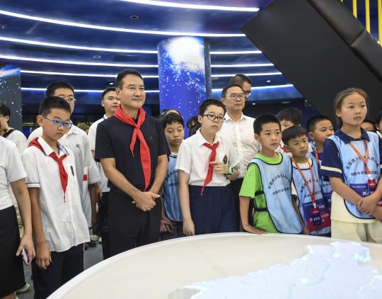 8月14日,中国人民解放军航天员大队特级航天员翟志刚参观珊瑚实验小学科技馆。