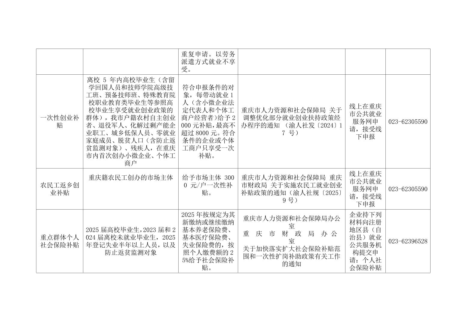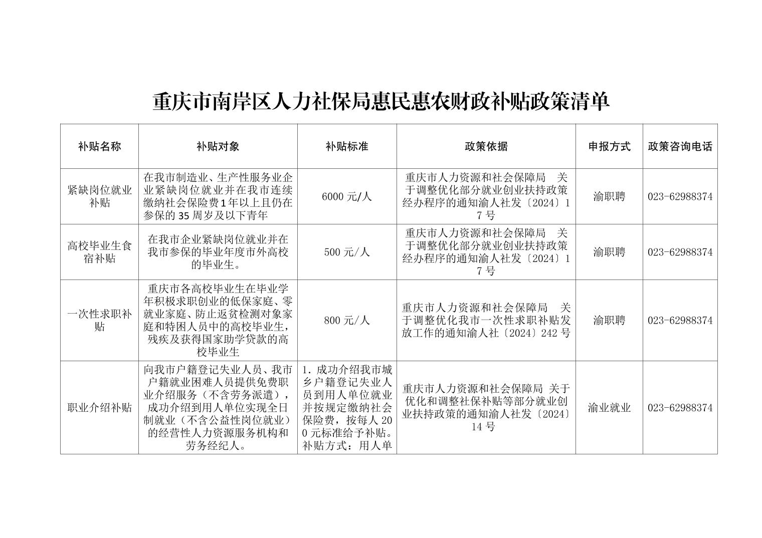 重庆市南岸区人力社保局惠民惠农财政补贴政策清单