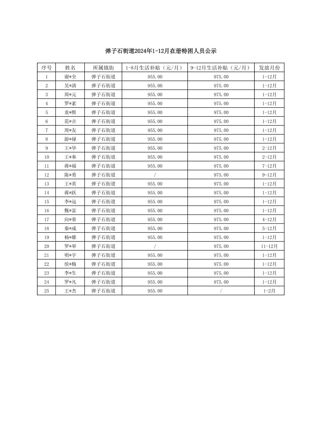 按照南岸区在册特困人员补贴有关规定,现将弹子石街道办事处2024年1-12月在册特困人员补贴花名册公示如下: