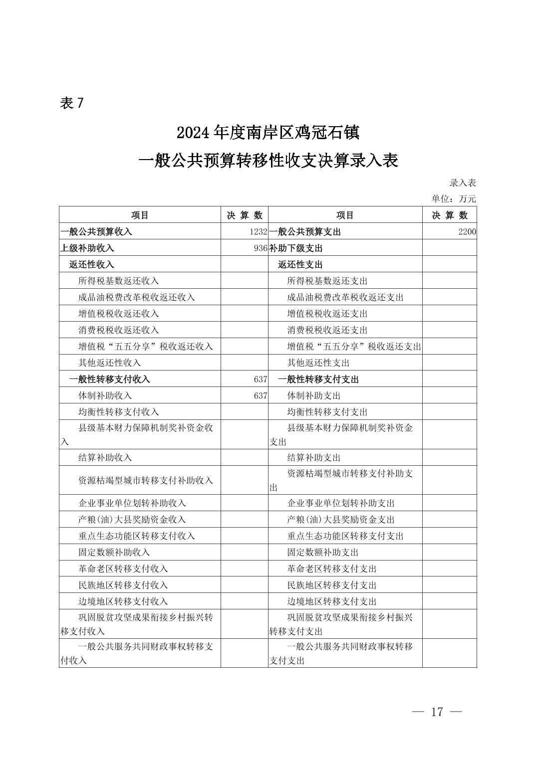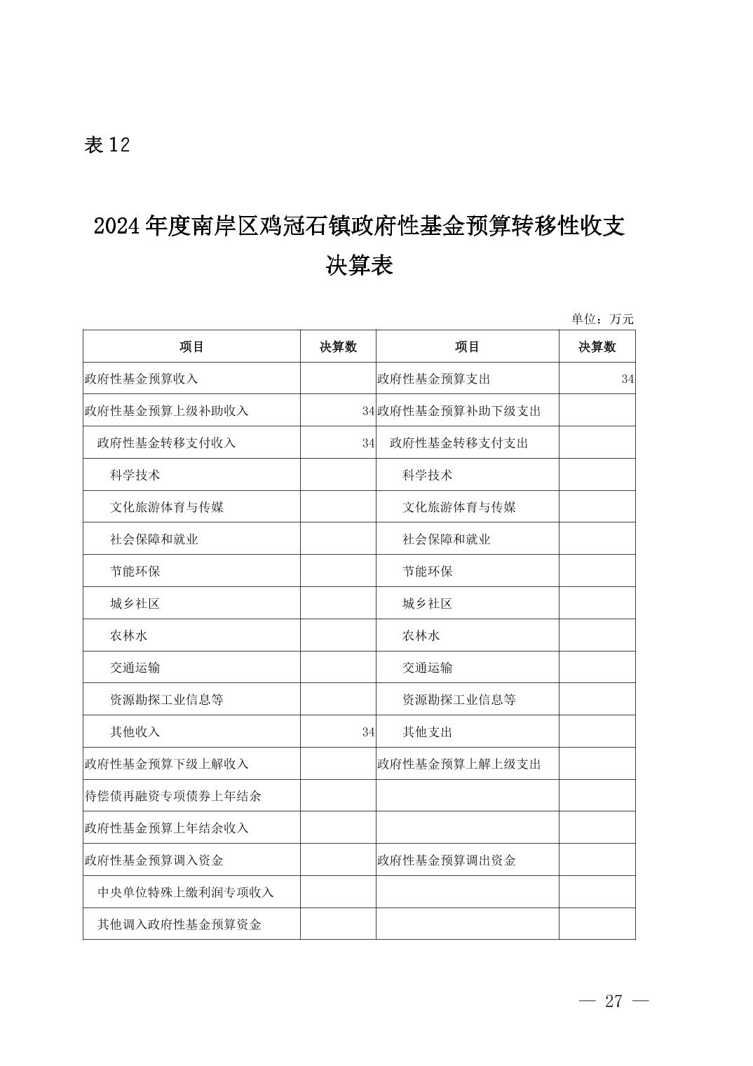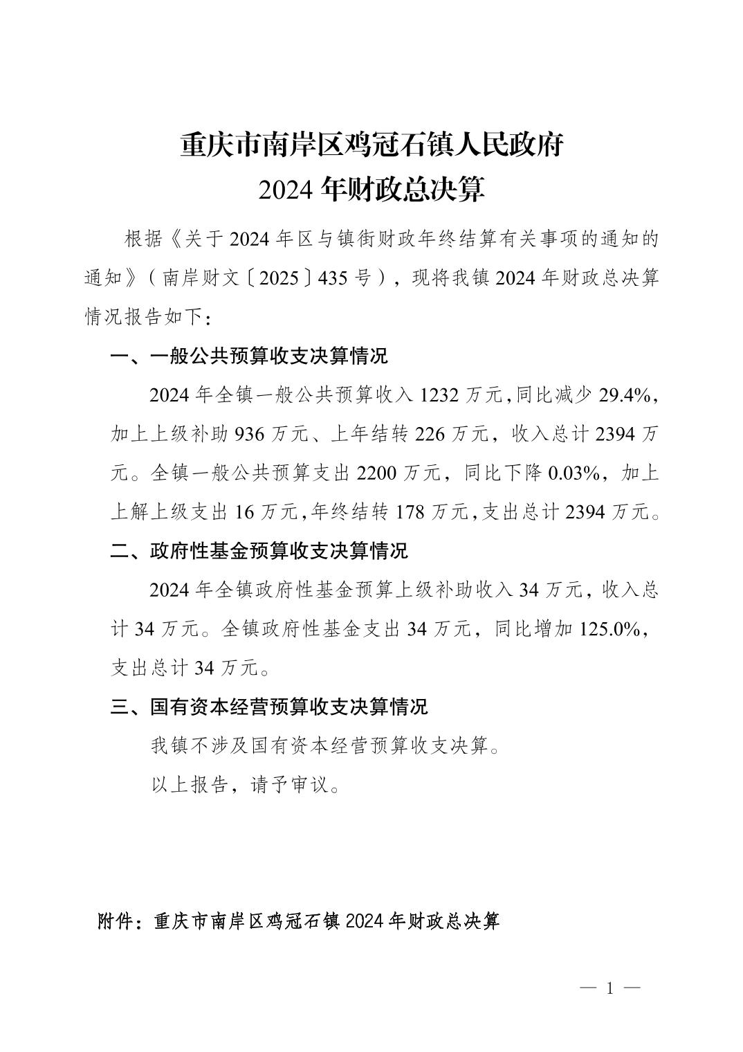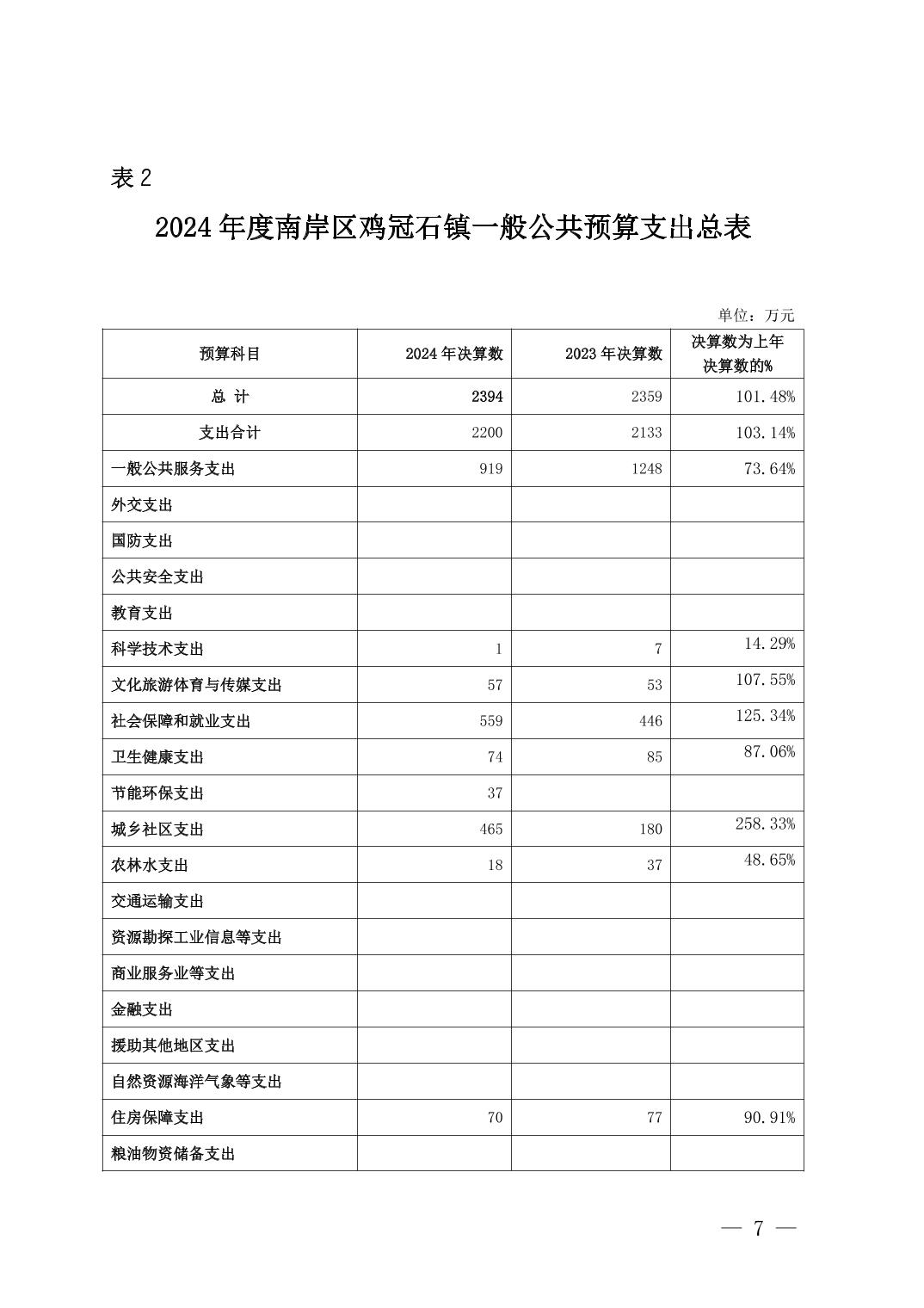 重庆市南岸区鸡冠石镇人民政府2024年财政总决算