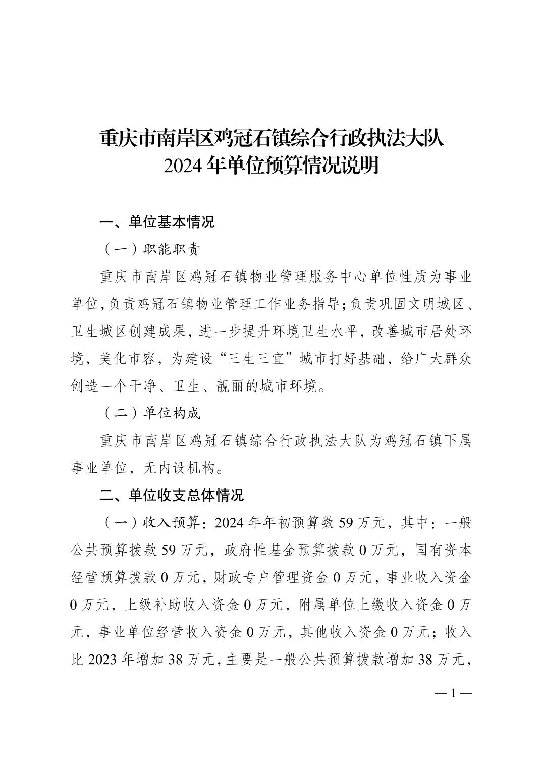 重庆市南岸区鸡冠石镇综合行政执法大队2024年单位预算情况说明