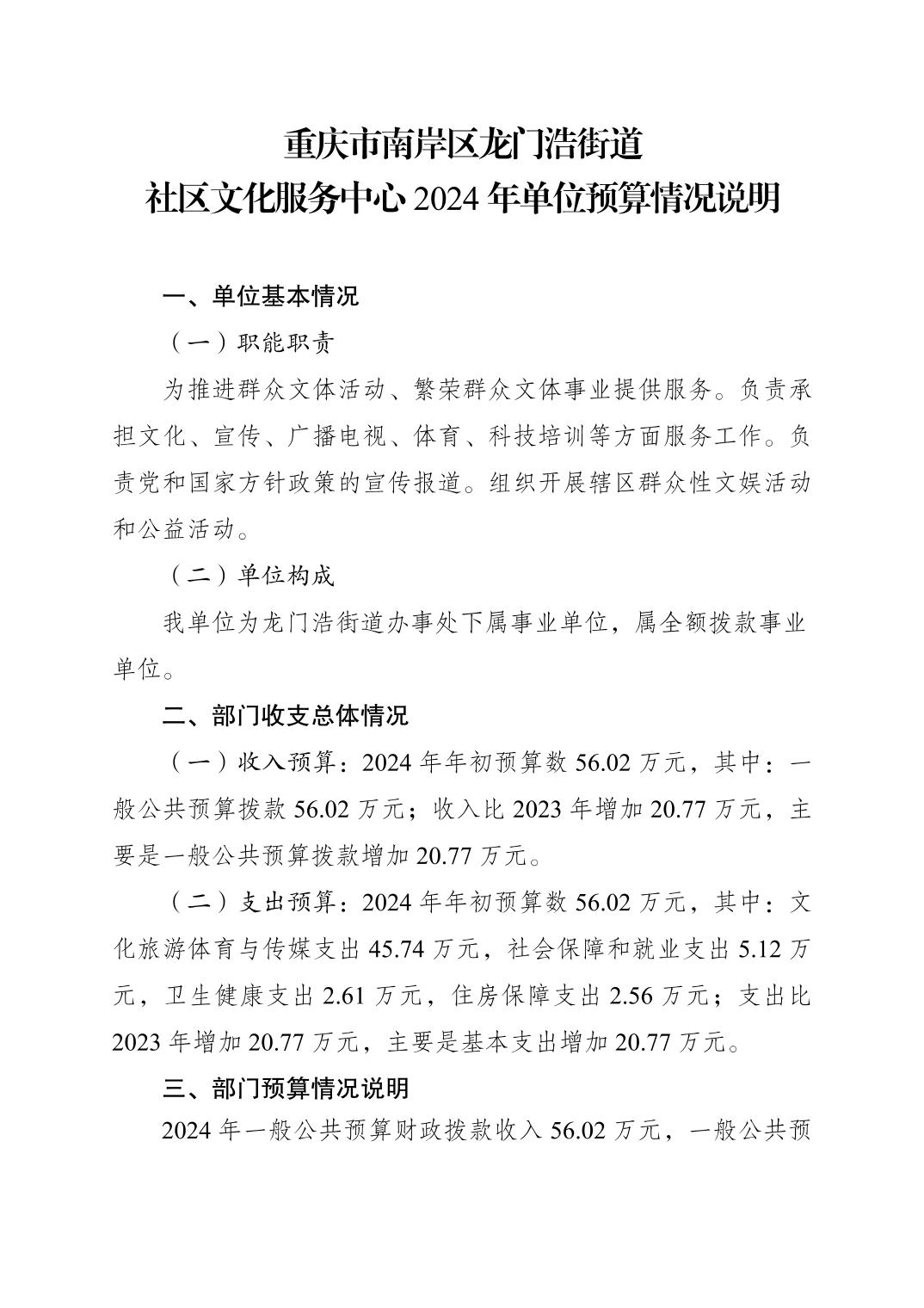 重庆市南岸区龙门浩街道社区文化服务中心2024年单位预算情况说明