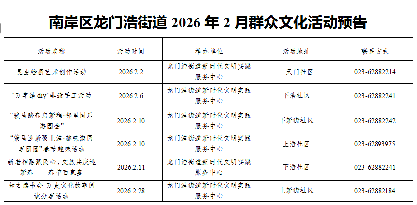 龙门浩街道2026年2月群众文化活动预告