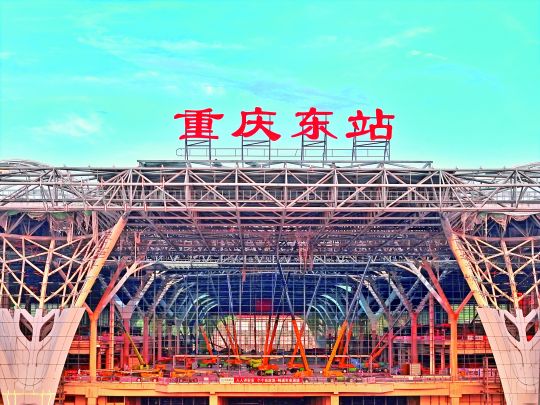 2024年8月17日,重庆东站正面正式挂牌。目前,重庆东站建设现场一片繁忙景象,该站台钢结构屋顶已完工,站房全面进入装饰装修施工阶段。
