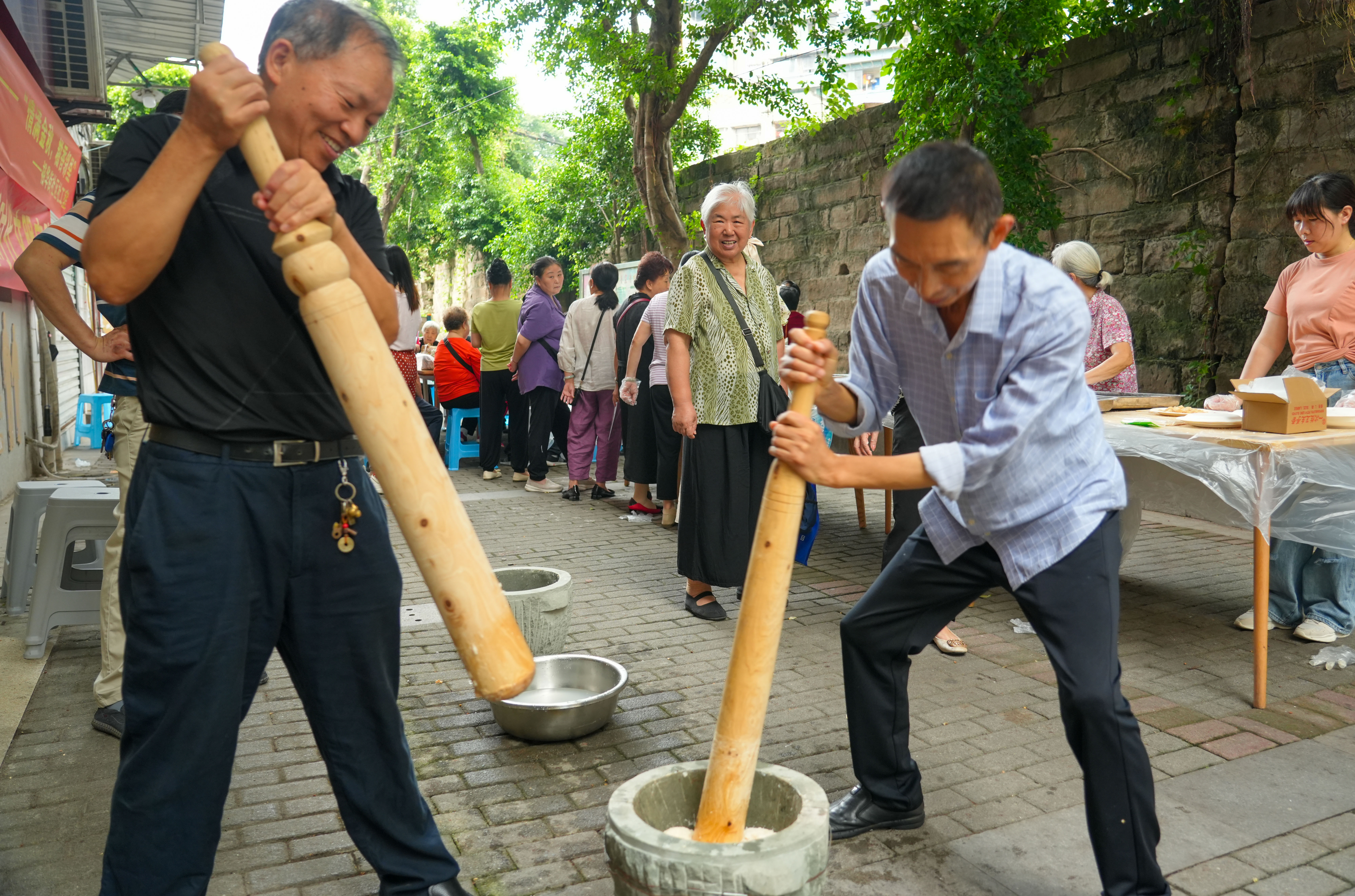 当天下午,在糍粑手工制作区,居民们自发组成“生产流水线”,默契协作。制作结束后,大家围坐在一起,品尝着亲手制作的美食,分享着生活中的趣事,交流着节日的习俗。社区还特别组织了志愿者将饱含全体居民祝福的热乎糍粑,以及节日问候一同送到社区独居、高龄老人家中。这份看似寻常的礼物,让老人们也深切感受到了节日的氛围和邻里的温暖。