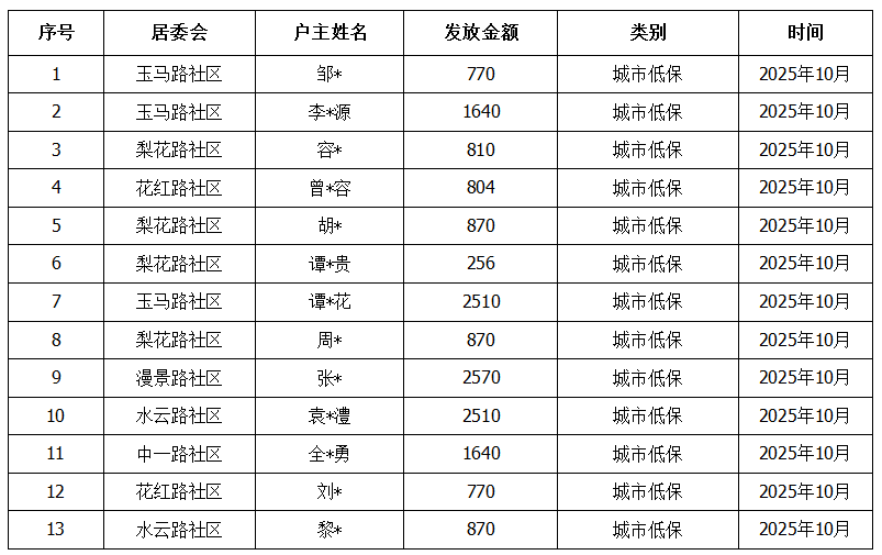 天文街道2025年10月困难群众救助补助-最低生活保障金发放情况