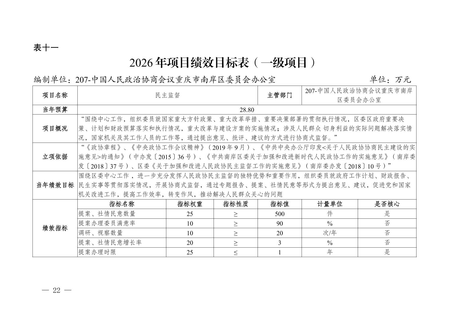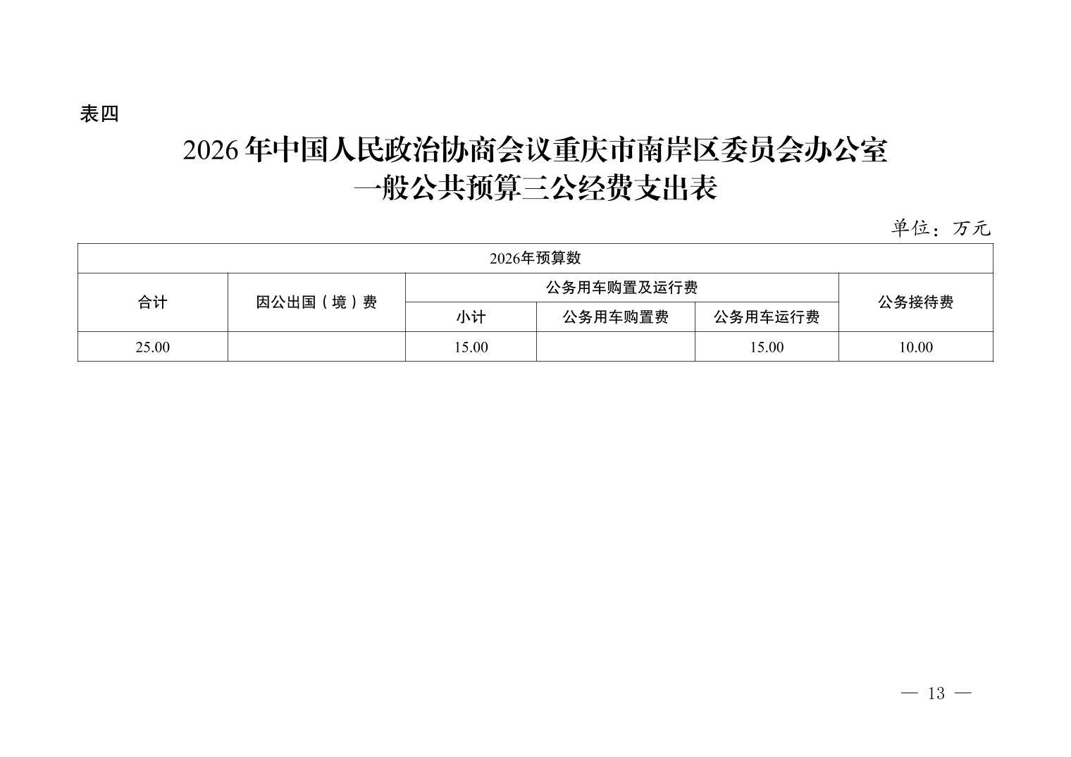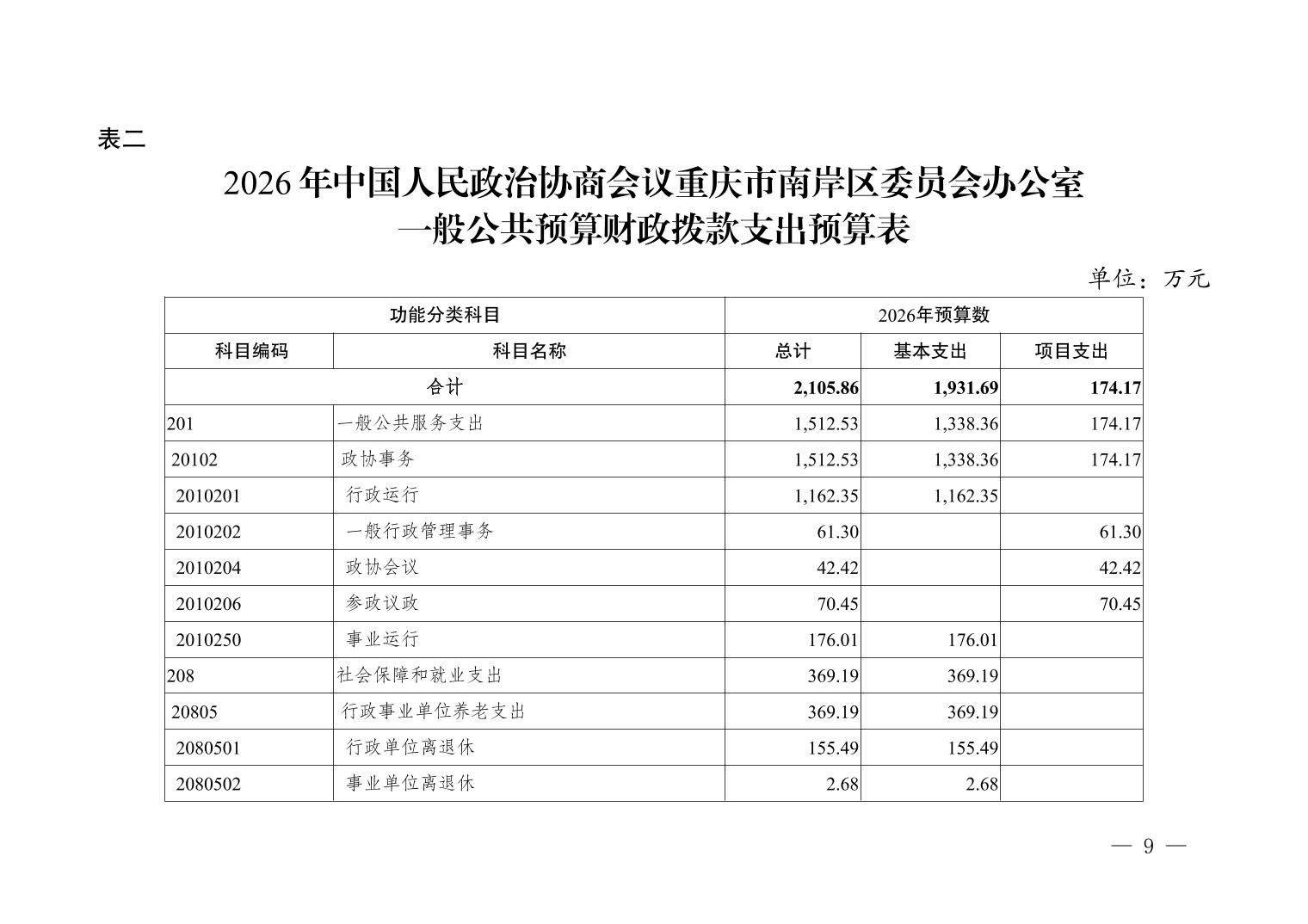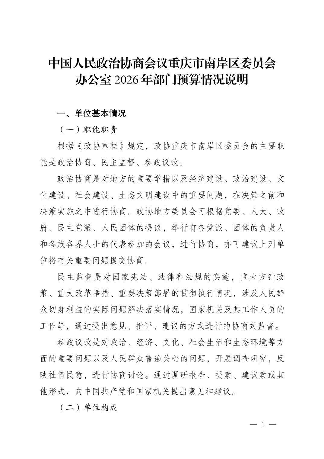 中国人民政治协商会议重庆市南岸区委员会办公室2026年部门预算情况说明