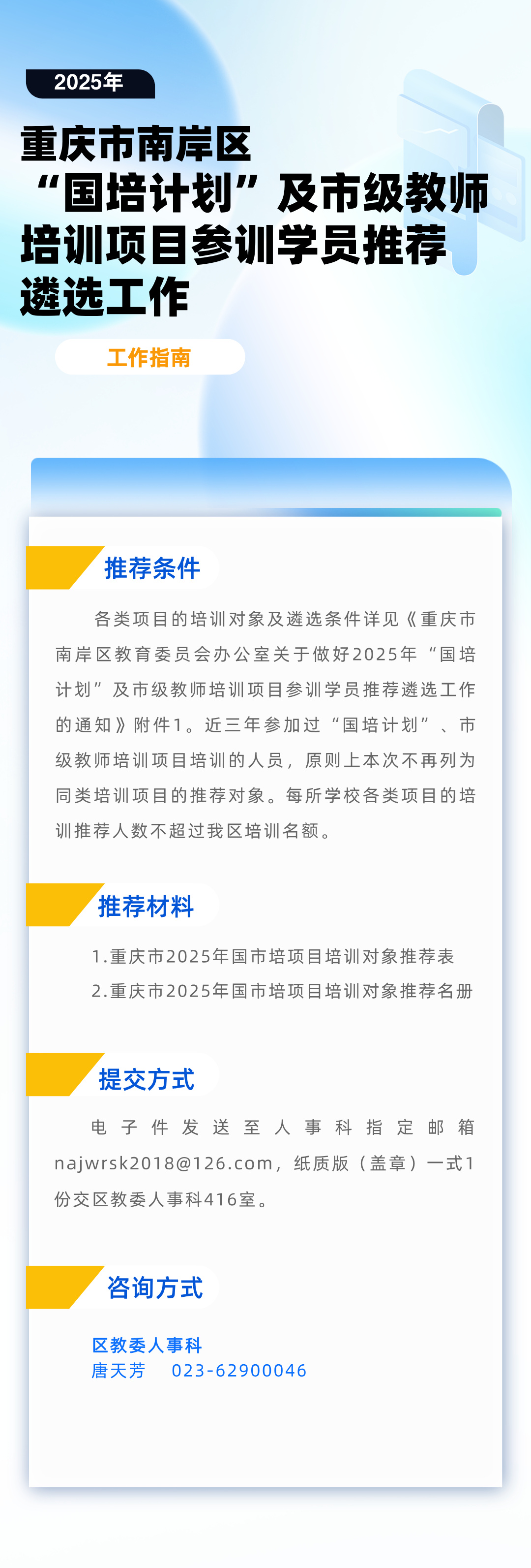 重庆市南岸区教育委员会办公室关于做好2025年“国培计划”及市级教师培训项目参训学员推荐遴选工作的通知