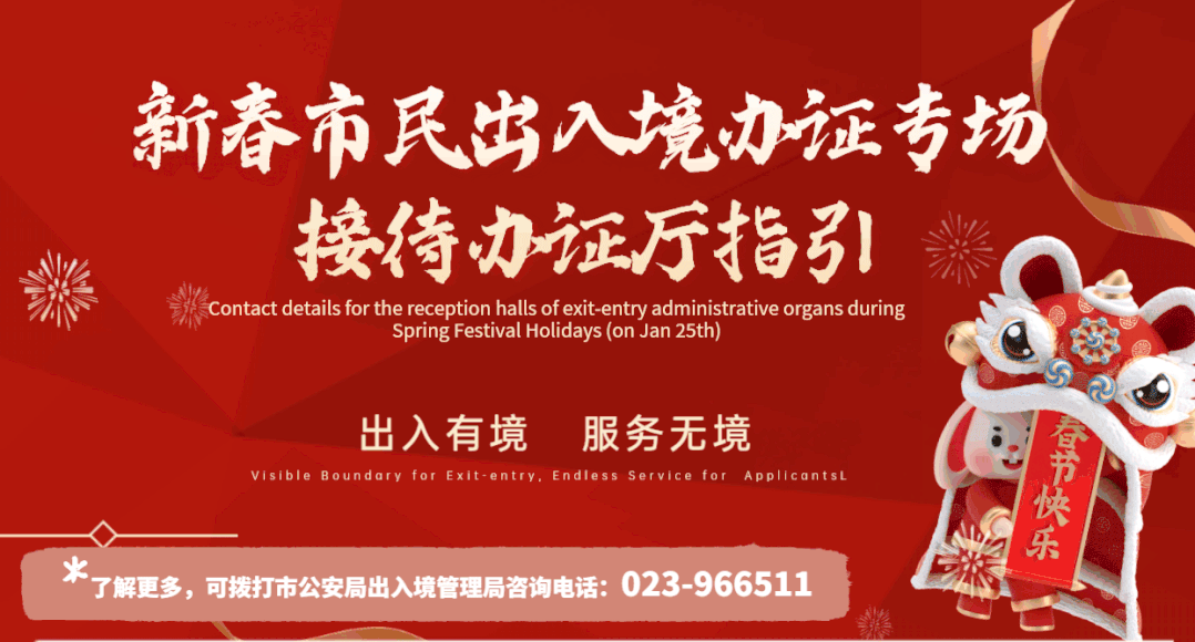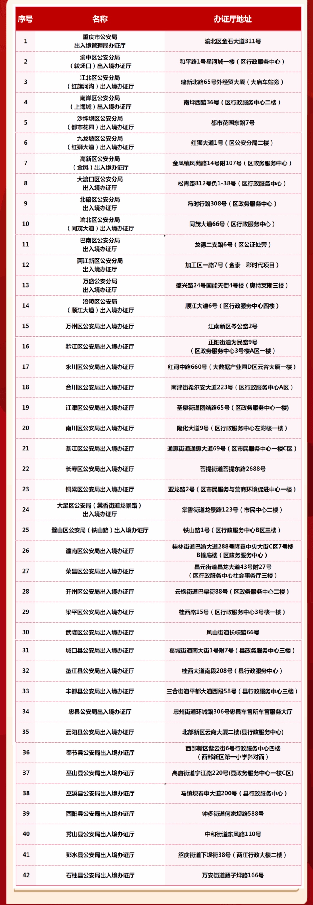 2023年新春佳节临近,在外地求学、工作、生活的重庆市民将陆续回渝与家人喜庆团圆度佳节。为方便有办证需求的市民和港澳台居民办理各类出入境证件,重庆公安出入境部门将在正月初四(1月25日)开设新春办证专场,全市42个出入境办证厅将开门接待(地址及咨询电话附后)。