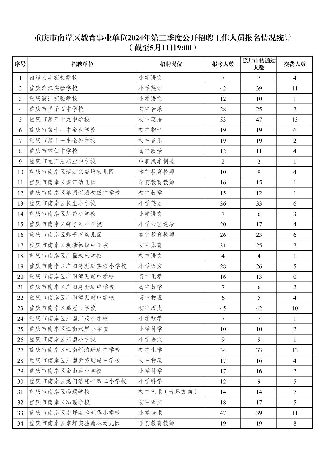 重庆市南岸区教育事业单位2024年第二季度公开招聘工作人员报名情况统计(5月11日)