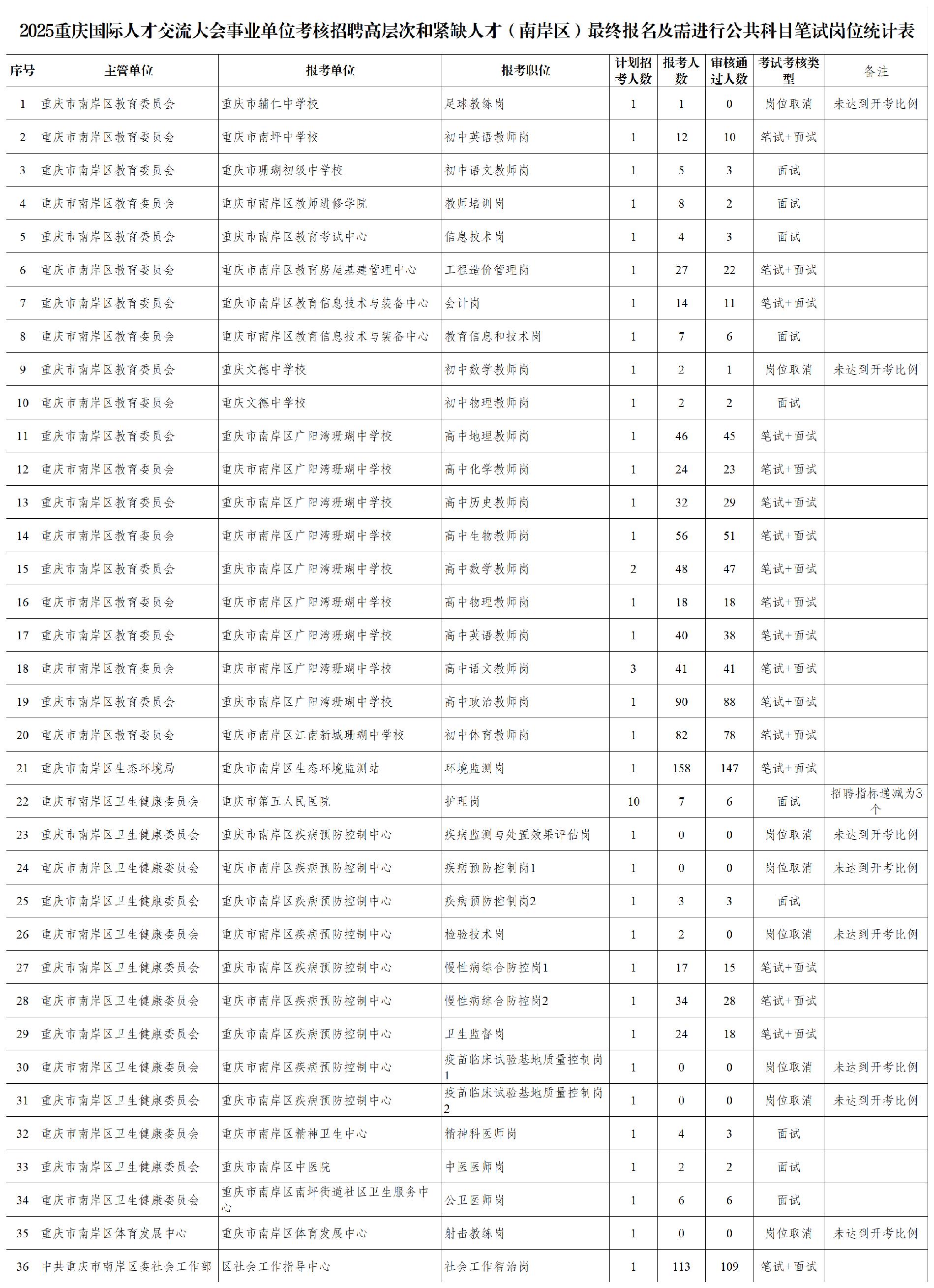2025重庆国际人才交流大会事业单位考核招聘高层次和紧缺人才(南岸区)最终报名及需进行公共科目笔试岗位统计表