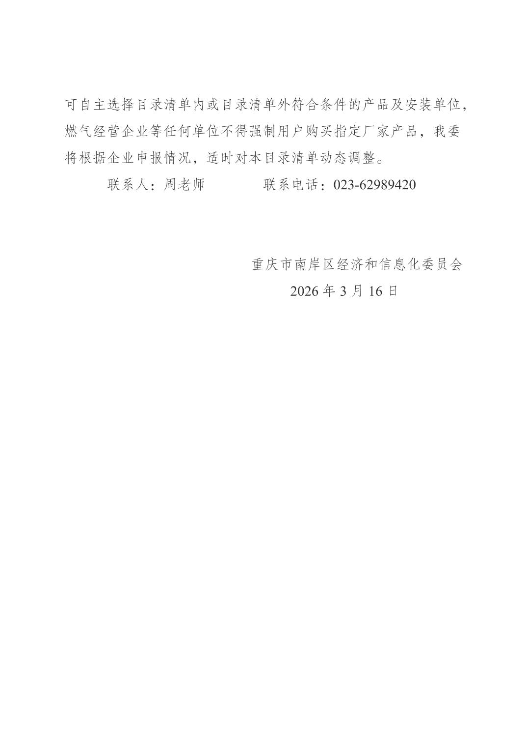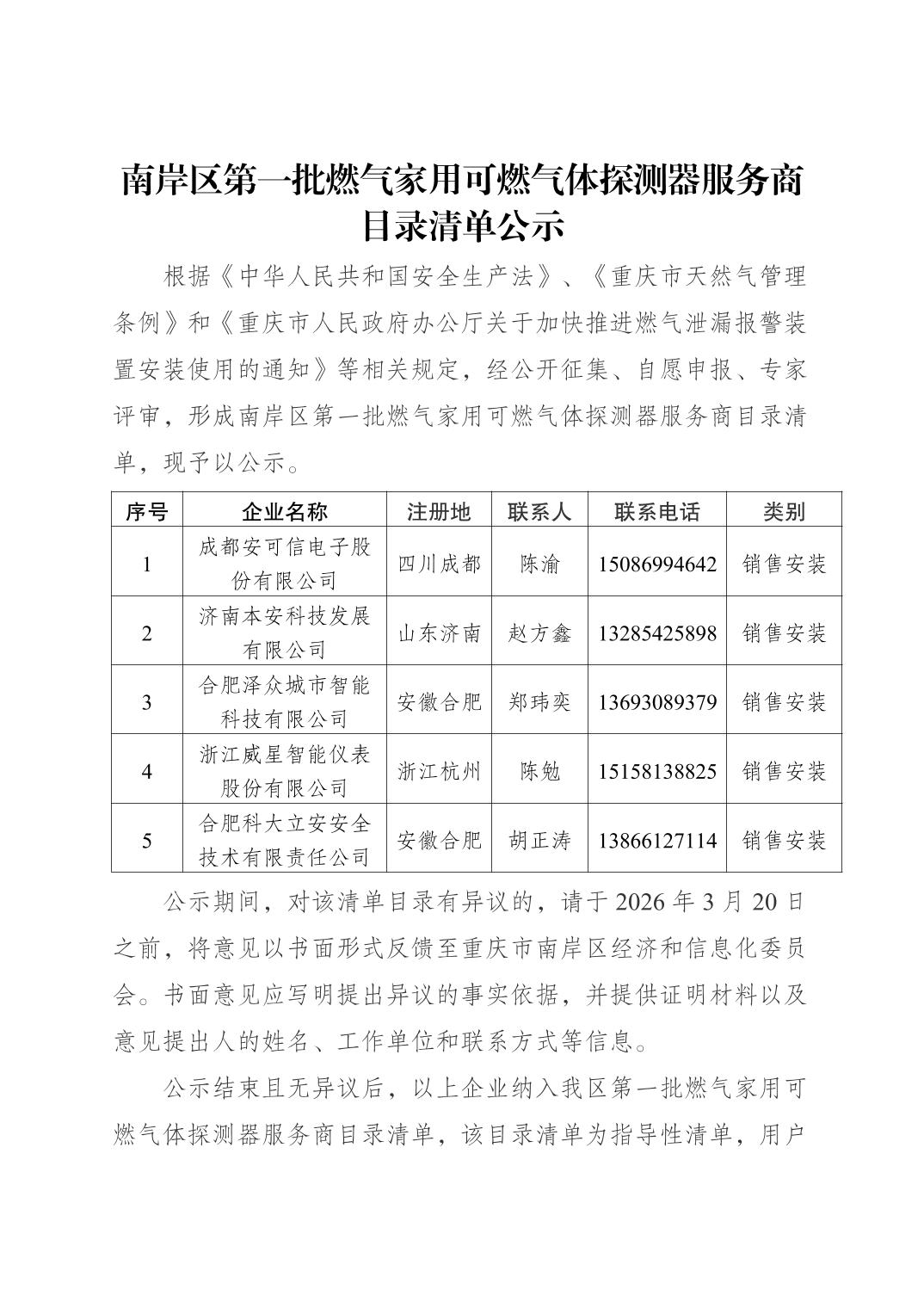 南岸区第一批燃气家用可燃气体探测器服务商目录清单公示