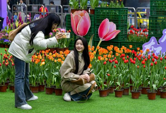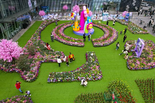 3月8日,在南坪商圈,一个商场联合重庆南山植物园,用郁金香、鲁冰花等花卉打造了一个超过1000平方米的沉浸式春日花海。繁华大道、5米花花城堡等景观,吸引众多市民前来打卡拍照。