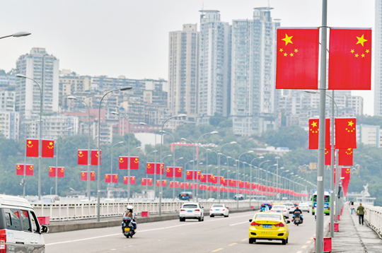重庆长江大桥国旗飘飘,节日氛围渐浓。 记者 崔景印 摄