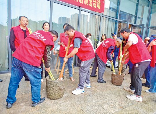活动当天下起了小雨,但丝毫挡不住群众的热情。迎龙舞动心声宣讲队以一曲啦啦操表演《我相信》拉开活动序幕。社区居民组织的腰鼓队进行了腰鼓表演,动作娴熟,赢得观众阵阵掌声。“糯米来咯!”当天活动的重头戏——打糍粑环节登场。一盘盘刚蒸好的糯米端上来,倒进石缸。志愿者和居民们用木棒和竹棒用力碾压,使劲捶打。糍粑打好后,大家现场品尝劳动成果。
