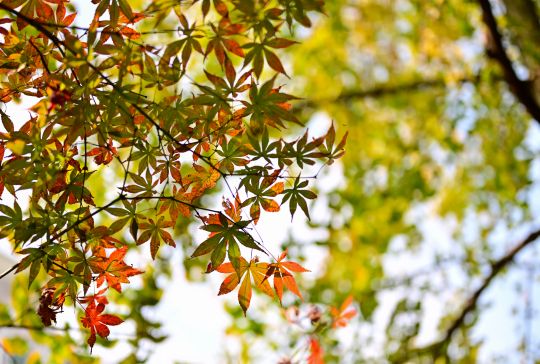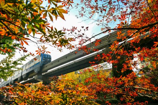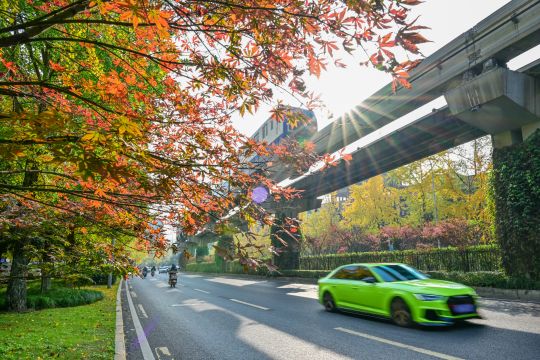 12月7日,南岸区学府大道,红枫夹杂着些许绿意,高高悬挂在枝头,透着层层叠叠的树影,宛如一幅油画,轨道交通三号线穿行在枫叶中,绘就冬日美景。 (记者 郭旭 摄)