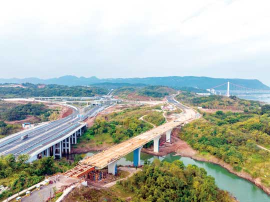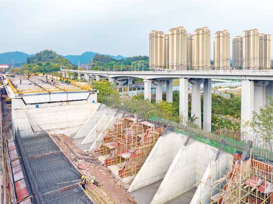 区级重点项目刘家坪立交工程完成主线桥钢箱梁吊装施工,已全面开展主线桥路基挡墙及B匝道施工。