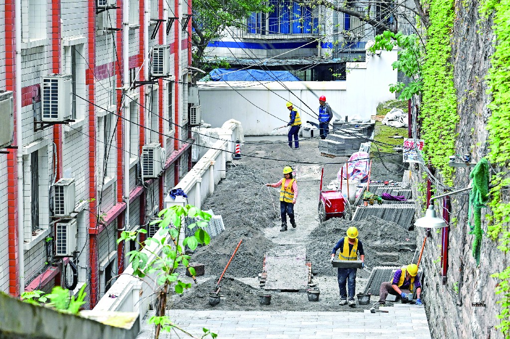 南坪街道东路社区居委会附近老旧小区改造现场。